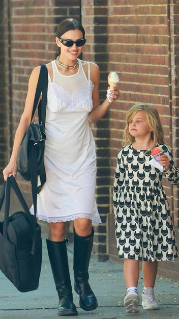 Ирину Шейк не просто так называют трендсеттером — знаменитость оказывает влияние на модную индустрию, демонстрируя нестандартные сочетания. Когда-то она задала тенденцию на ношение сумки-мешка в спортивном стиле, а теперь предлагает нам поэкспериментировать с платьем в бельевом стиле. Его она надела не на голое тело, как мы привыкли, а поверх трикотажного топа, тем самым придав аутфиту дерзость и непринужденность.