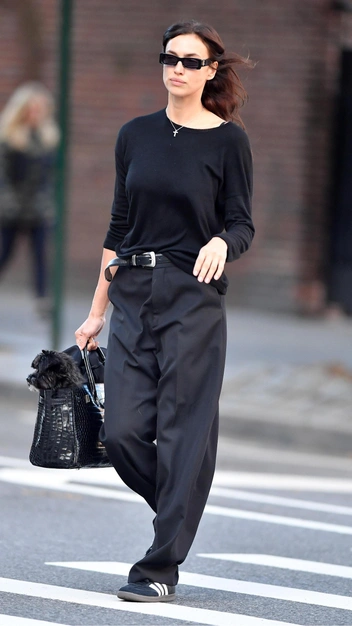 Если вы поклонница черного цвета, как и Ирина Шейк, тогда запоминайте ее тотал-лук, который всегда будет в тренде. Топ-модель примерила актуальный лонгслив свободного кроя и подобрала к нему широкие брюки, закрепив их на талии кожаным ремнем с крупной пряжкой. Образ она дополнила модными кедами в винтажном стиле, однако главным аксессуаром все же стала вместительная лакированная сумка — мастхэв сезона.