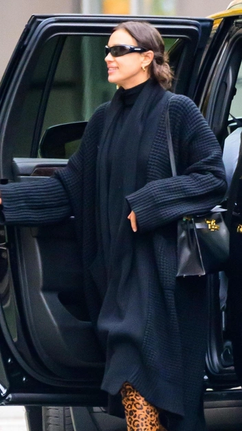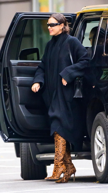 Ирину Шейк можно встретить на улицах Нью-Йорка не только в тотал-блэке — в последнее время она все чаще делает в образах акценты. Так, для недавнего выхода супермодель выбрала платье-свитер, поверх которого она надела свободный вязаный кардиган с накладными карманами. К наряду знаменитость подобрала эффектные сапоги на высоком каблуке в оранжевом цвете с леопардовым принтом и балансировала их очками в духе нулевых и кожаной сумкой.