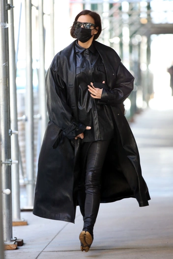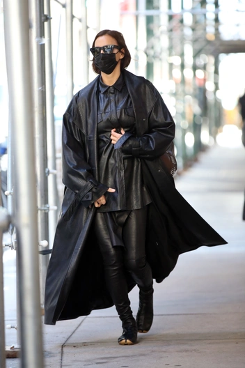 Кожаный тотал-лук в черном исполнении — любимый фэшн-ход российской супермодели, которая обожает брутальное звучание в повседневных образах. В холодные месяцы комбинация кожи и тотального черного смотрится особенно выигрышно и легко вписывается в сезонный колорит. Ирина выгуливает микс с черными облегающими брюками, курткой-рубашкой в тон и кожаным тренчем. Лук дополняют ботинки на плоской подошве, черные очки и защитная маска.