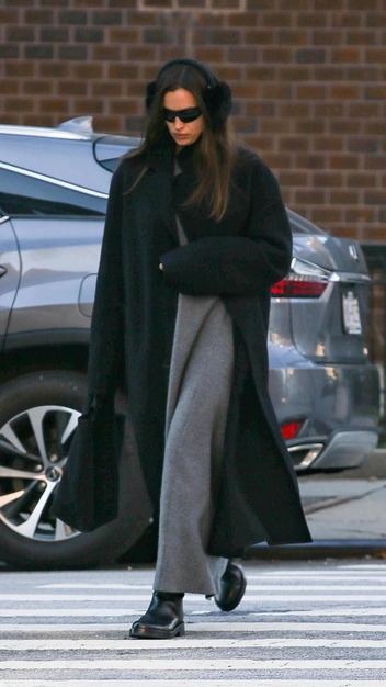 Ирина Шейк и черный цвет — это лучшее сочетание, которые мы наблюдаем в последнее время. Однако на этот раз она решила разнообразить модный выход плотным серым платьем в пол, дополнив его классическим объемным пальто и кожаными ботинками. Супермодель поддалась тренду и на меховые наушники и вспомнила детство, найдя для себя самый стильный и лаконичный аксессуар.