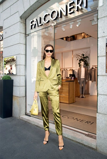 Даже за пределами кэтуолка Ирине удается выглядеть так, как будто она идет по подиуму: в Милане она успела заглянуть во флагманский бутик Falconeri, и этот выход сразу приковал к себе внимание фотографов. Для мероприятия Шейк подобрала элегантный брючный костюм от бренда кашемира из натурального шелка в зеленом оттенке. Аутфит дополнила аккуратная сумочка в лимонном цвете. Берем на заметку: зеленый и лимонный прекрасно дополняют друг друга, так что осенью выгуливаем это сочетание как можно чаще.