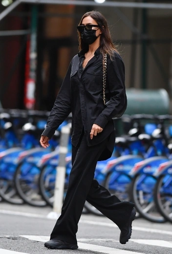 Если выбор стоит между черным и белым, Ирина с большей долей вероятности остановится на первом колор-варианте: по крайней мере, в повседневном стритстайле звезда подиумов чаще всего отдает предпочтение именно ему. Для деловых перебежек по городу супермодель примеряет расслабленный костюм в тотальном черном с летящими брюками и рубашкой оверсайз, который является прекрасным примером универсального гардероба. Ирина дополняет аутфит кроссовками в тон, черной сумкой с золотой цепочкой и солнцезащитными очками.