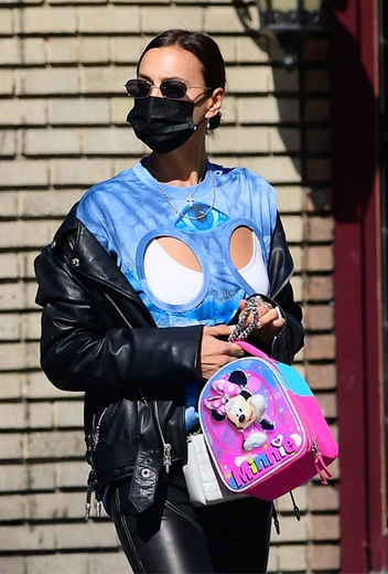Последнее время Ирина Шейк увлеклась брутальными нарядами и все чаще показывает, насколько стильно может одеваться мама во время прогулки с ребенком. Последнее время стиль Ирины Шейк стал более дерзким и брутальным: топ-модель носит кожу, оверсайз-куртки и худи, мрачную палитру и всевозможный декор из заклепок. Новый образ также был навеян этой тематикой: звезда примерила объемную косуху, облегающие кожаные брюки и фантазийный топ с принтом tie-dye.