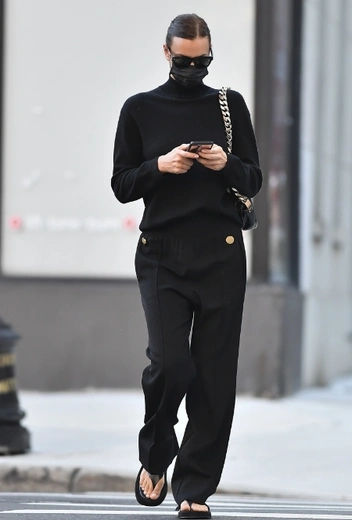 Последние выходы Ирины Шейк — ее личное признание в любви к черному и тотал-лукам в его исполнении. Супермодель из раза в раз выбирает их для повседневных выходов, демонстрируя отличный вкус на осенние варианты монохромных луков. В этот раз выбор звезды пал на комбинацию с обычный водолазкой и классическими брюками. Аутфит дополнили флип-флопы в урбан-стиле, черная сумка на золотой цепи и солнцезащитные очки в тон.