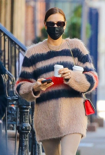 За свою карьеру Ирине Шейк удалось стать музой не одного модного Дома, но сама она из года в год демонстрирует преданность любимому бренду Burberry с его традиционной бежево-черной палитрой оттенков, в которых звезда подиумов появляется на улицах города чаще всего. В марте Ирина расстается с пальто и переходит на облегченный формат луков со свитерами и массивными ботинками. Брючный аутфит с участием нюдового, черного и красного тонов знаменитость дополняет сапогами на шнуровке, солнцезащитными очками и красным клатчем на цепи.