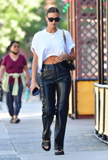 Ирина Шейк всегда показывает смелые и стильные сочетания, которые нередко могут показаться чересчур рискованными, поэтому появление топ-модели в кожаных брюках в разгар летнего зноя совсем не удивительно. Правда, чтобы сделать образ практичным (и главное – комфортным), звезда пользуется одним популярным лайфхаком: комбинировать эту теплую вещь с легкими предметами гардероба. В случае Ирины такая роль отведена свободной укороченной футболке от Burberry, а также практичным и массивным сандалиям, дополненным миниатюрной сумочкой с массивной цепью.
