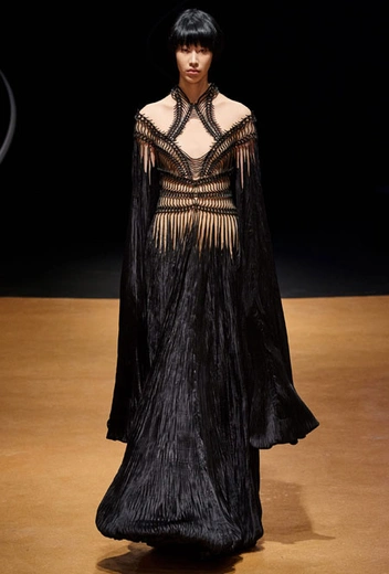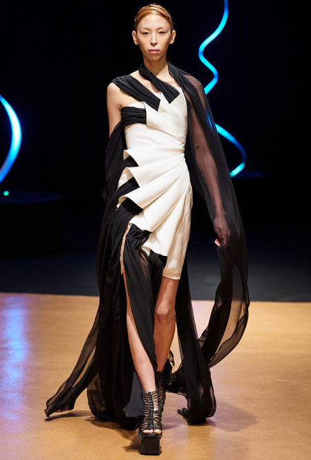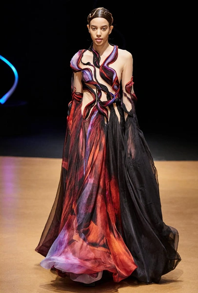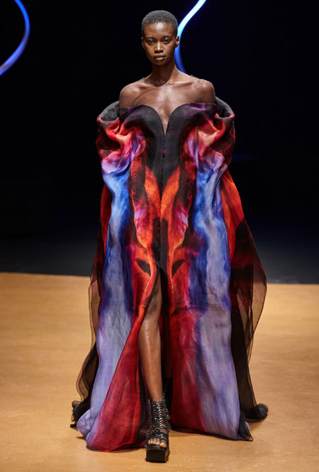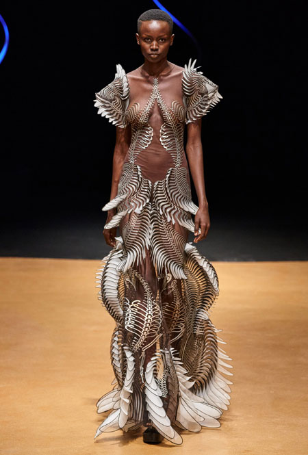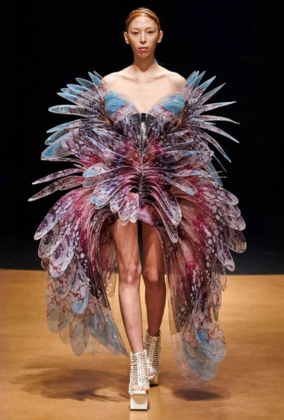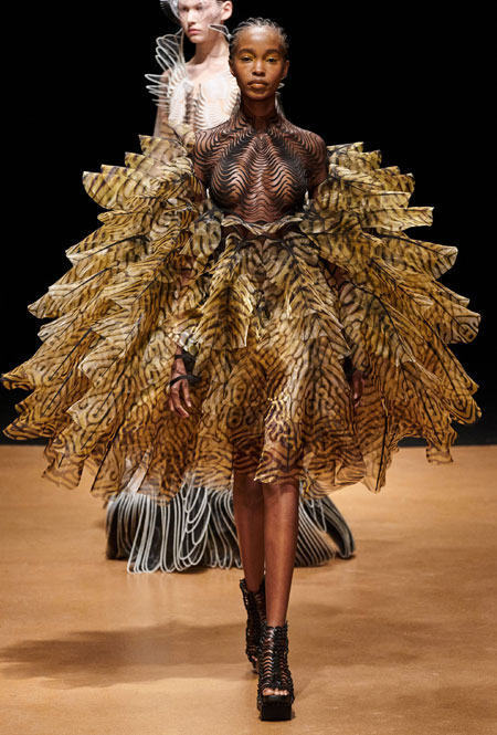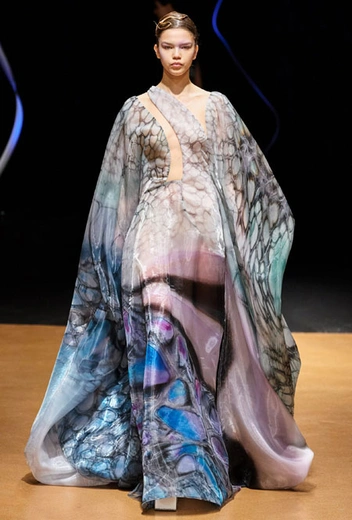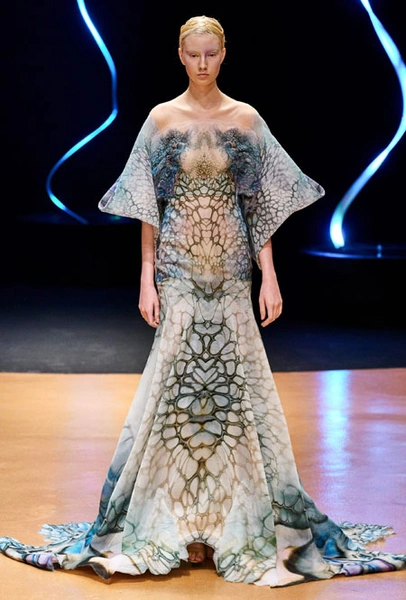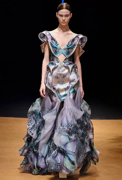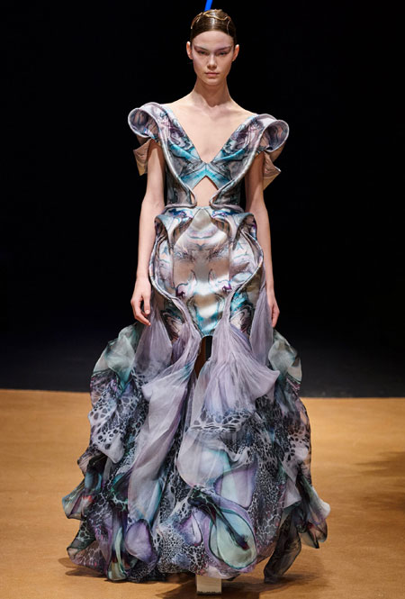 Волшебница Айрис ван Херпен не устает удивлять публику парижской недели моды своим мастерством, и новая коллекция Sensory Seas исключением не стала. Голландский дизайнер вновь представила футуристичные платья с оборками и необычными принтами, наряды из органзы, с плиссировкой и фигурными вставками. Завершали экстраординарные наряды босоножки на массивной платформе.