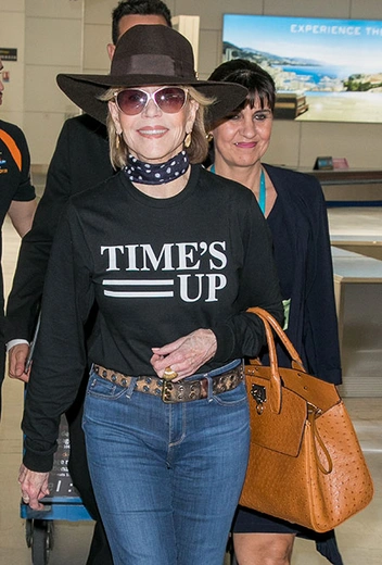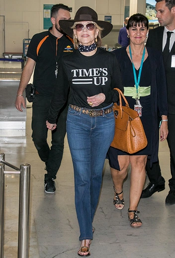 Каннский кинофестиваль в самом разгаре, а звезд на южном берегу Франции все больше и больше. 12 мая в аэропорту города Ниццы была замечена Джейн Фонда: 80-летняя актриса прибыла на киносмотр в качестве зрительницы. Для перелета Джейн выбрала наряд в стиле кантри, главным акцентом которого стал свитшот с лозунгом Time's Up («Время вышло»). В свете недавнего феминистского протеста в Каннах — очень актуальный выбор!