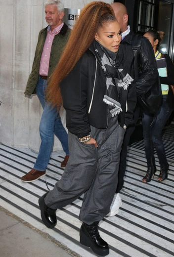 В этом году бояться объемной одежды не стоит: надев плащ с большими плечами или повязав толстый шарф, вы точно пребудете в рамках тренда. Так что берем пример с Джанет: в ее случае объемны и массивны все детали (даже обувь).