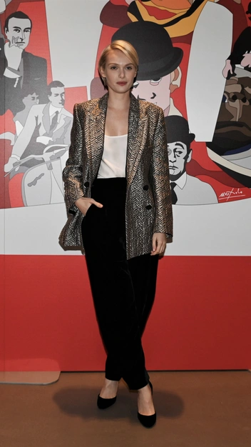 Кацярына Шульга, актриса родом из Беларуси, появилась в безупречном выходе. Она выбрала нежную шелковую блузу и зауженные брюки на высокой талии. Подчеркнула образ Кацярына фактурным жакетом, который гармонично смотрится с другими струящимися тканями. В качестве обуви знаменитость надела классические балетки, которые снова возвращаются в моду.