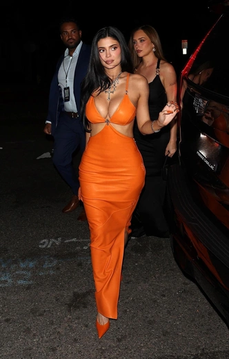 Кайли сияет, как неоновая вывеска ночного Вест-Голливуда: ярко-оранжевое кожаное платье с дерзким декольте и вырезами на талии подчеркивает ее идеальный силуэт «песочные часы», лодочки и мини-сумка в тон создают эффект цельного глянцевого аутфита, а серебристые украшения добавляют остроту и драматизм. Главное, младшая Дженнер не забыла про баланс: элегантно уложенные темные волосы и естественный макияж смягчают общий образ, сохраняя внимание на платье — ярком и запоминающемся, словно светящемся на фоне городских огней.