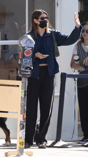 Кайя Гербер на встречи с друзьями одевается всегда лаконично и со вкусом. Знаменитость знает, как подчеркнуть свою фигуру и какие цвета сделают образ выигрышным. На этот раз она появилась в широких модных джинсах-трубах, синем укороченном свитере с V-образным вырезом и куртке из денима. К аутфиту Кайя подобрала зеленую сумку и черно-белые кроссовки.