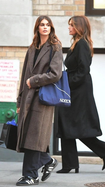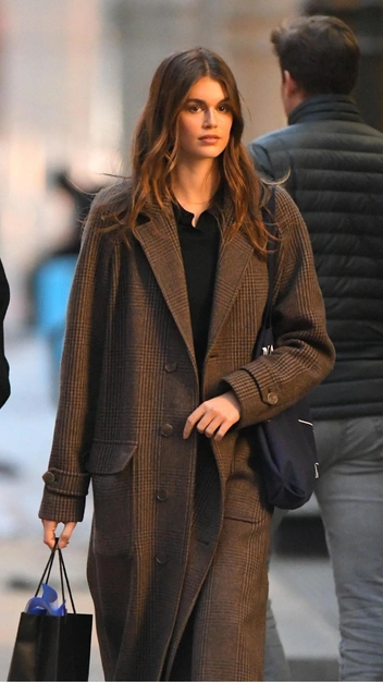 Выходные Кайя Гербер провела в компании мамы Синди Кроуфорд на шопинге. Для выхода она выбрала лаконичный образ, в котором нет ничего лишнего. Она примерила минималистичный черный джемпер и прямые расслабленные брюки. Стильным элементом в аутфите стало коричневое пальто в клетку прямого кроя с накладными карманами. Завершили выход базовые кроссовки и синий шопер, которые гармонично вписались в общую цветовую палитру.