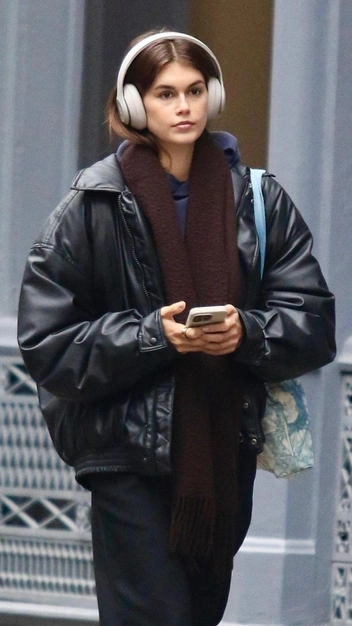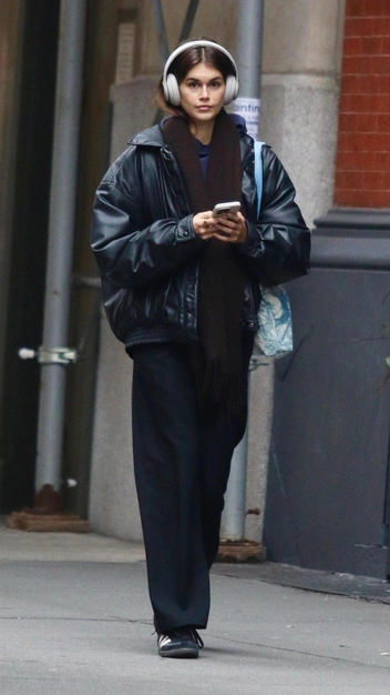 Кайе Гербер всегда удается выглядеть просто и стильно за счет актуальных качественных вещей и безупречного цветового сочетания. Так, недавно топ-модель была замечена в лаконичном образе. На ней: худи в синем оттенке, расслабленные широкие брюки и трендовый кожаный бомбер свободного кроя. К аутфиту она подобрала черные замшевые кеды в винтажном стиле, объемный шарф в кофейном оттенке и сумку-шопер.