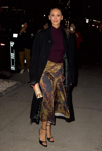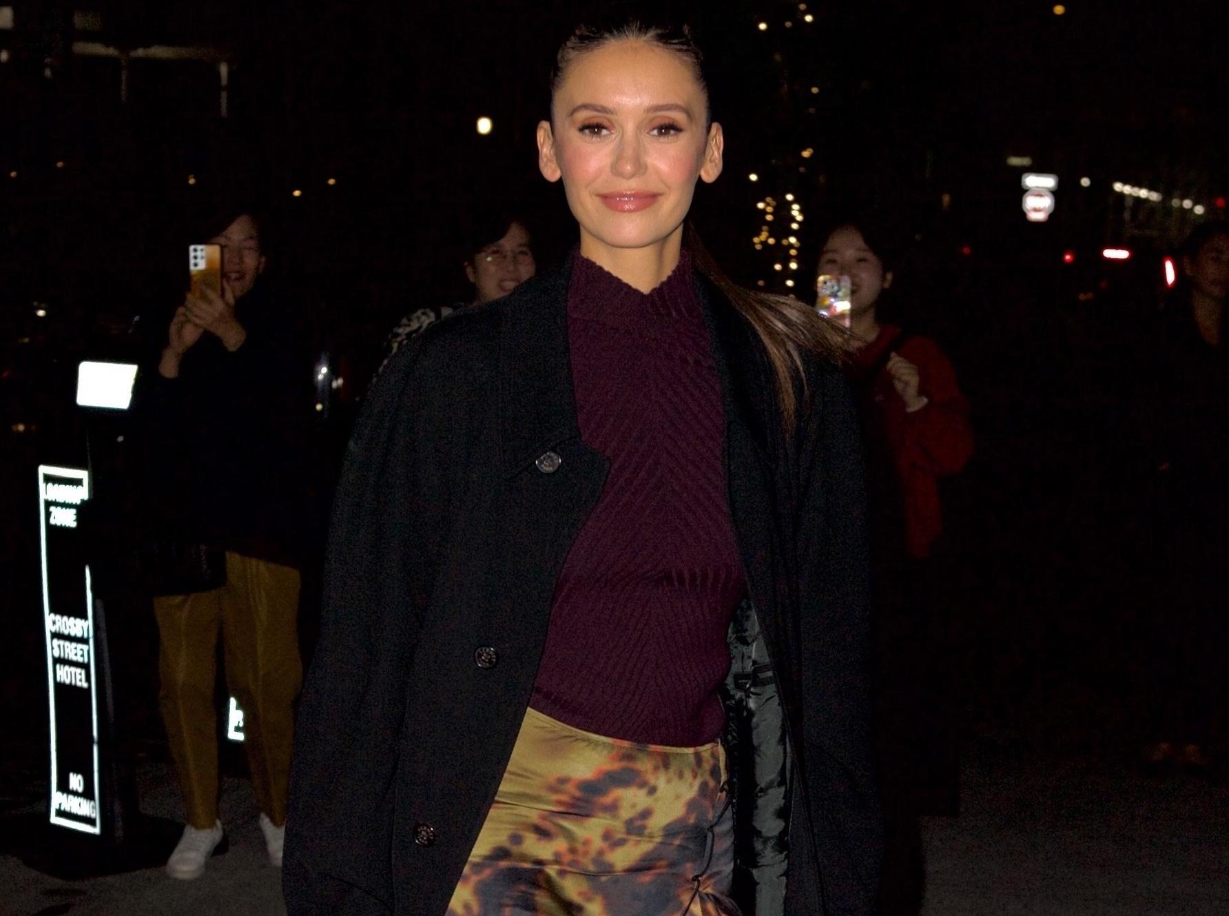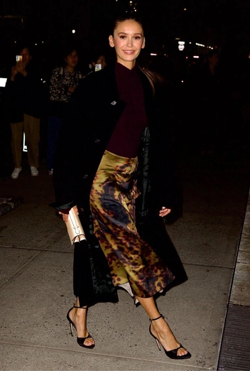 Нина Добрев всегда отличалась своим непревзойденным стилем — будь то выход на красную дорожку или повседневная прогулка, случайно запечатленная папарацци. Для своего очередного светского появления актриса тоже тщательно продумала образ. Нина выбрала водолазку в самом трендовом цвете сезона — сливовом, которую заправила в юбку-миди с необычным зелено-коричневым принтом. Этот оттенок прекрасно сочетается со всеми тонами фиолетового. Образ дополнили длинное черное пальто и классические босоножки, добавившие элегантности и завершенности.