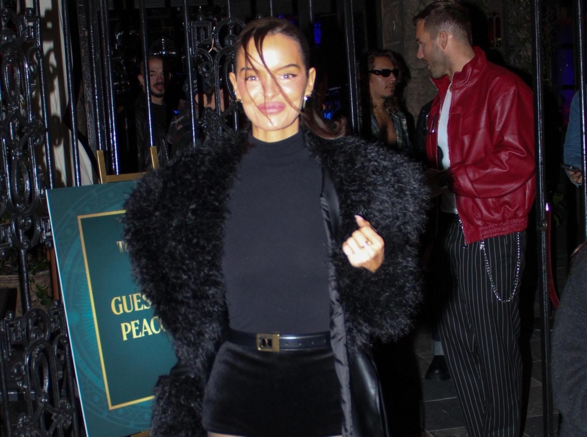 Мойра собирает тотальный total black, в котором все работает на нее: ультракороткие бархатные шорты с высокой посадкой и черные колготки практически сливаются в единое полотно, визуально удлиняя ноги и подчеркивая силуэт. Длинное пальто с фактурным меховым верхом и остроносые лодочки с небольшим каблуком завершают образ — за счет темного цвета, высокой талии и смещения акцента на меховой ворот ноги кажутся еще длиннее, так что этот прием можно спокойно брать на заметку для любых вечерних выходов.