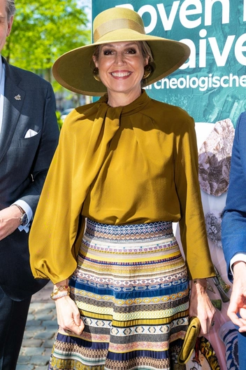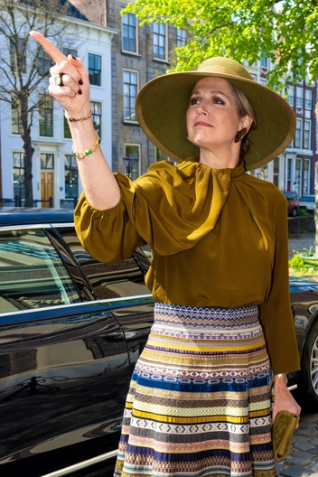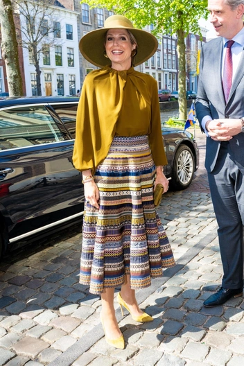 Несколько дней назад королеву Максиму заметили на шопинге, и теперь мы видим его плоды. Так, для недавнего выхода монарх собрала образ с акцентами горчичного оттенка.