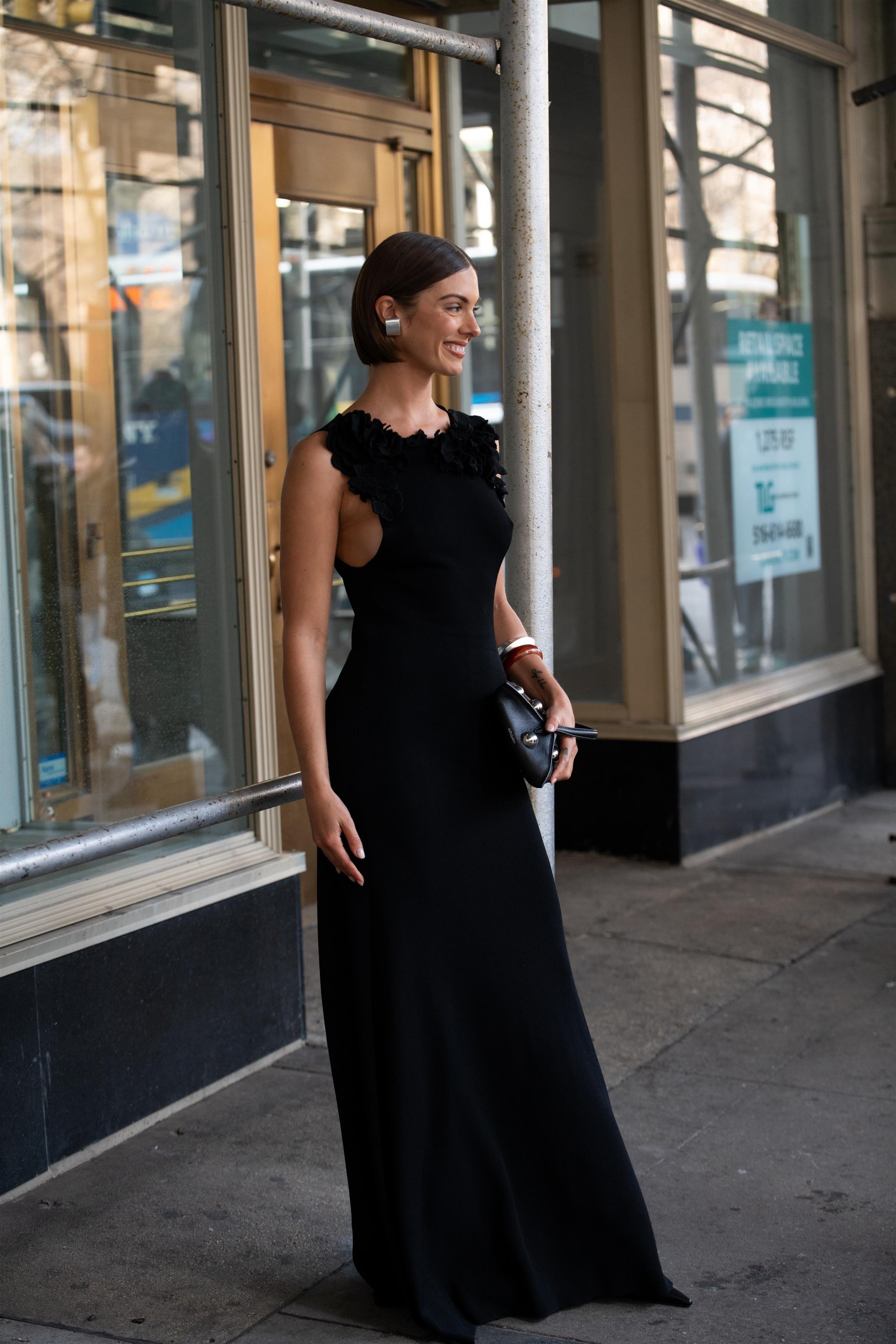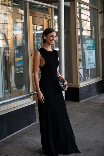 Современная элегантность у Кармеллы Роуз — это смелое минималистичное платье в пол. Глубокие проймы и открытые руки добавляют образу кинематографической чувственности, а матовая черная ткань «гасит» драму, делая силуэт вытянутым и утонченным, как у героинь старого Голливуда, но без ретро-настроения. Цветочные аппликации заменяют привычные украшения: вместо колье — фактурный текстильный «воротник», который мягко обрамляет лицо и шею. Сдержанный клатч и скульптурные серьги подчеркивают архитектуру платья, а гладко убранные волосы усиливают вертикаль силуэта — за счет этого аутфит выглядит свежо и женственно.