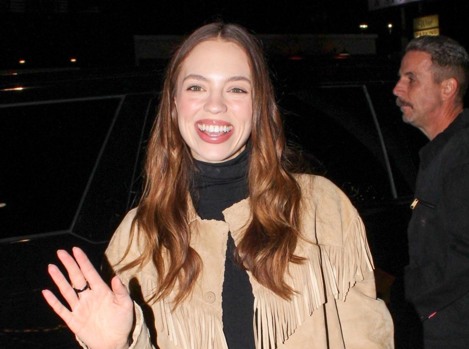 Для светского мероприятия Ralph Lauren Клаудия выбирает расслабленный вариант американской классики: светлая замшевая куртка с длинной бахромой, черный базовый топ и прямые синие джинсы. Образ выглядит максимально ненавязчиво и приземленно, но именно текстура замши и «движение» бахромы придают ему модный кантри‑акцент, который идеально совпадает с эстетикой бренда. Минимум деталей и аксессуаров подчеркивают непринужденное настроение — будто это спонтанный городской выход, а не отрепетированный red carpet‑выход.