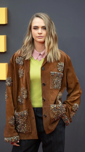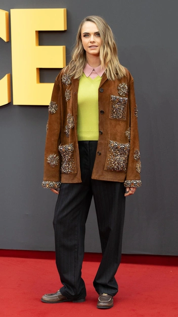 Кара Делевинь носит самую модную куртку сентября, которая уже есть в коллекции всех стильных девушек. Она выполнена из замши коричневого оттенка, а также имеет форму пиджака, за счет чего ее легко сочетать с любым гардеробом: от уличного до вечернего. Звезда дополнила ею многослойный лук: она надела розовую рубашку, фисташковый джемпер и брюки в мужском стиле. Завершили образ грубые ботинки.
