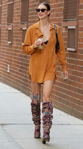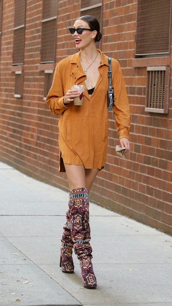 Карли Клосс уверена, что правильно подобранная обувь может в корне изменить любой лук. Добавь модель к платью-рубашке терракотового оттенка любые другие сапоги или туфли, то образ не смотрелся бы таким интересным и стильным. Звезда выбрала фактурные сапоги чуть выше колена на каблуке, со сборкой и принтом. Завершили образ солнцезащитные очки и миниатюрная сумка.