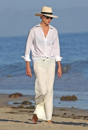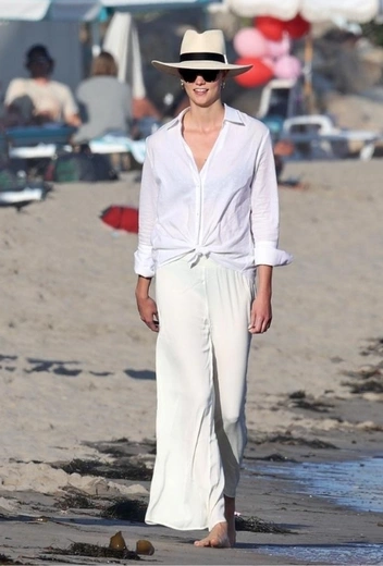 За последние несколько недель многие инфлюенсеры и селебрити отправились в долгожданные путешествия — правда, в этом году довольно скромные из-за разыгравшейся пандемии коронавируса. Этим летом супермодель и бизнесвумен Карли Клосс часто выбирается с близкими друзьями на пляжи Санта-Моники и не забывает продумывать аутфиты для каждой прибрежной прогулки. В минувшие выходные знаменитость сделала выбор в пользу брючного образа в total-white, который составили кремовые струящиеся брюки, белая льняная рубашка и шляпа с широкими полями.