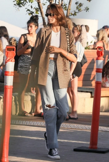 Сочетание классического жакета, простого белого топа и рваных джинсов с черными конверсами — вариант, который подойдет для любого случая жизни и не займет много времени для составления. Кайя дополнила образ черными солнцезащитными очками, минималистичными аксессуарами и модной сумкой на одно плечо от Stella McCartney. К слову, клетчатый жакет — универсальный элемент гардероба, с которым жизнь станет легче в любом сезоне, поэтому если вы еще не обзавелись им, очень советуем сделать это как можно скорее.
