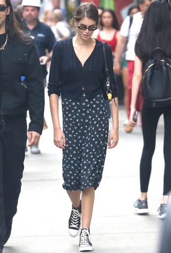 Кардиган – один из самых спорных трендов года. Многие все еще относятся к этой вещи довольно скептически: она уже успела побывать в списке антитрендов, но сейчас громогласно возвращаются к нам вновь, чему мы очень рады. Звезды ценят их за удобство и носят их каждый день: Кайя Гербер, например, сочетает облегающий вариант от Brandy Melville со свободной юбкой с принтом и удобными кедами Converse.