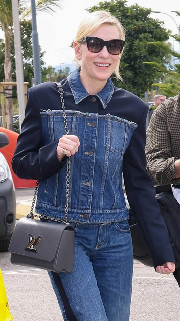 Кейт Бланшетт не смогла устоять перед трендом на деним и повторила образ в духе нулевых. Голливудская звезда надела костюм из джинсов с темно-синими лампасами и куртки, верх и рукава которой по крою напоминают пиджак. К аутфиту она подобрала необычные бежевые закрытые туфли на платформе и серую сумку на длинной цепи. Завершили выход модные солнцезащитные очки.