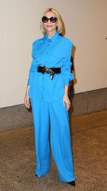 Восхищаемся умением Кейт Бланшетт опережать главные модные тенденции. Знаменитость была замечена в костюме в самом популярном цвете весны и лета 2025, но его, разумеется, можно и нужно носить уже сейчас. Она примерила удлиненную рубашку в сочетании с широкими брюками и подчеркнула талию акцентным кожаным поясом. Завершили выход остроносые туфли и крупные очки.