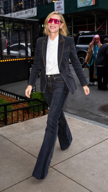 Австралийская актриса надела стильный костюм с брюками, который идеально вписывается в повседневный гардероб. Кейт облачилась в сет из денима с приталенным жакетом и расклешенными джинсами. Образ дополнили белая рубашка и крупные цветные очки.