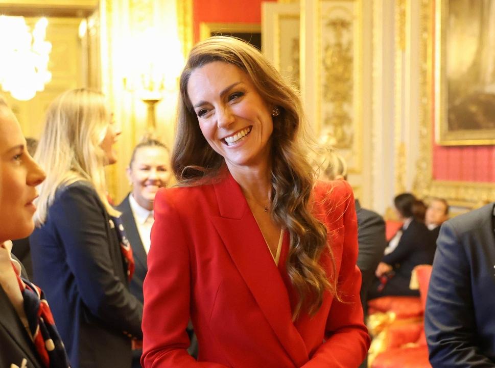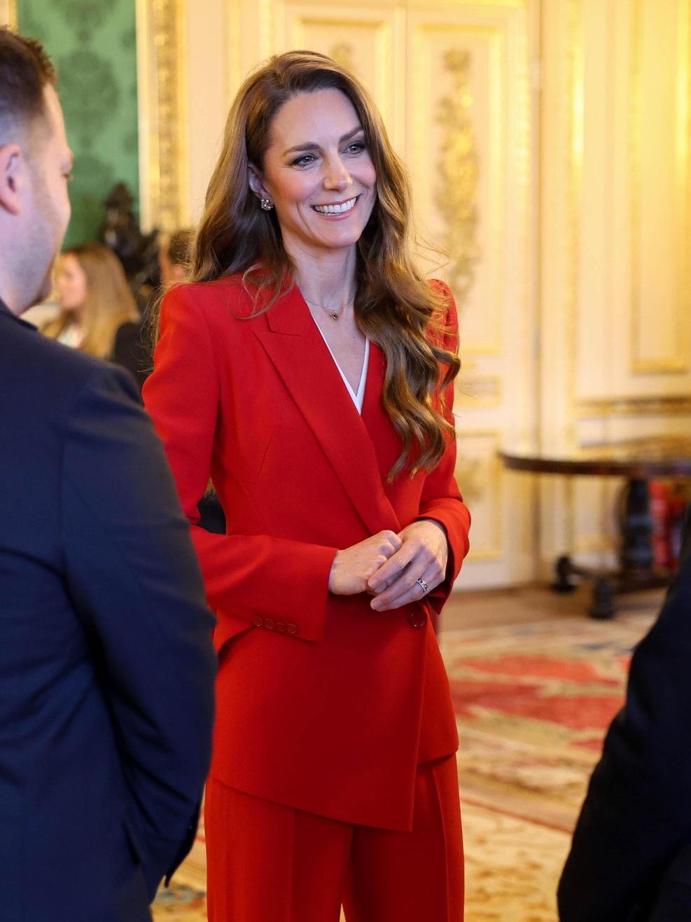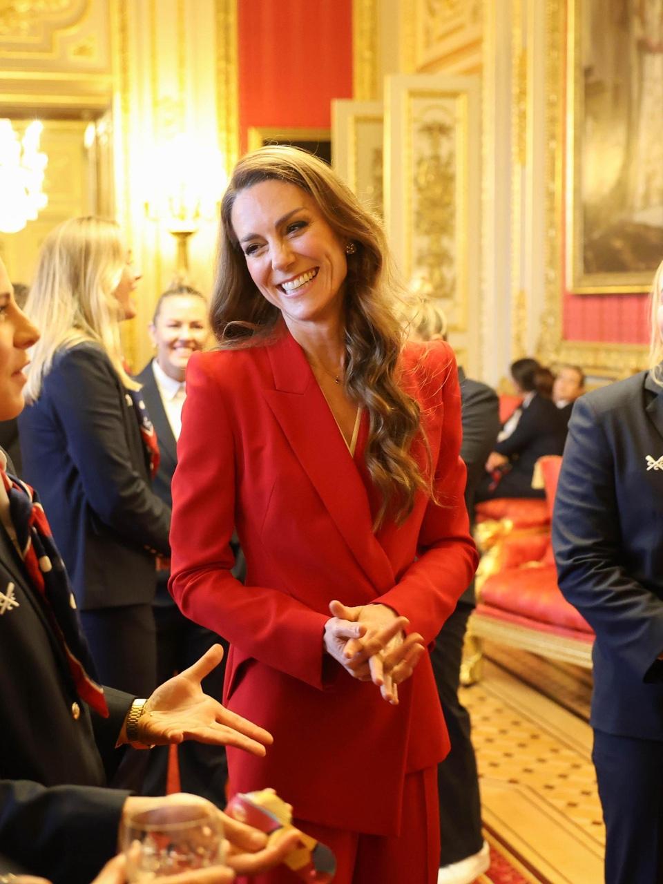 Принцесса Уэльская принимает в Виндзорском замке женскую сборную Англии по регби после их триумфа на Кубке мира в сентябре 2025 года, превращая официальный прием в теплое, почти семейное мероприятие. Поздравления и живые разговоры явно показывают, что женский спорт занимает в британской повестке столь же почетное место, как и мужской. В духе «королевского power‑dressing» Кэтрин выходит к девушкам в насыщенном алом брючном костюме с удлиненным двубортным жакетом и широкими брюками, мгновенно выделяющими ее среди темных форменных пиджаков спортсменок. Мягкие волны смягчают строгую архитектуру образа, превращая его в модное высказывание о том, каким может быть идеальный современный аутфит будущей королевы.