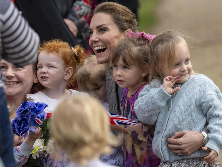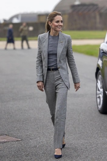 Кейт Миддлтон может и не повторяет каждый яркий тренд в своем гардеробе, зато приемы сочетания цветов в аутфите ей точно близки. Как в этом образе для посещения Базы Королевских военно-воздушных сил, где принцесса появилась в сером брючном костюме с темно-синим поясом, идеально подходящим к лодочкам Gianvito Rossi и серьгам Уэльской с сапфирами. Как часто бывает, в образе Кейт не обошлось без пасхалок. На этот раз ею была сентиментальная отсылка к мужу — принт клетка на костюме Кэтрин носит название «принц Уэльский».