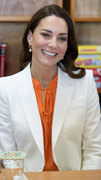 Супруга принца продолжает радовать поклонников безупречными нарядами. На очереди — белый костюм с однобортным приталенным жакетом и брюками со стрелкой. К монохромному комплекту Кейт подобрала ярко-оранжевую блузу и сумку ей в тон. Образ завершили классические белые лодочки и серьги с жемчугом.