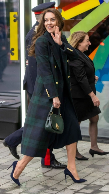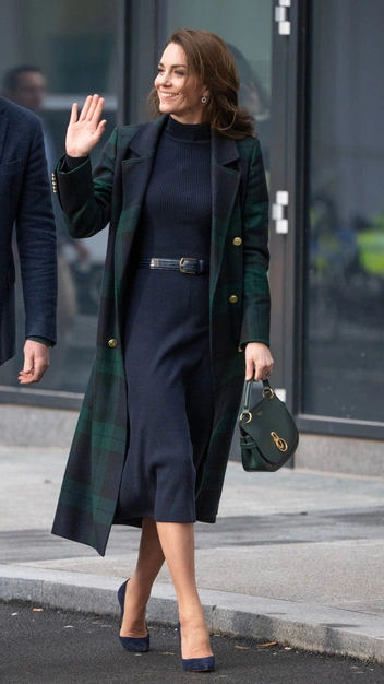 Кейт Миддлтон прибыла на открытие университетского госпиталя в Ливерпуле вместе с принцем Уильямом в обворожительном наряде. Монаршая особа для мероприятия выбрала классическое приталенное платье в темно-синем оттенке, которое подчеркнула ремнем с золотой пряжкой. Поверх него принцесса Уэльская накинула безупречное пальто в клетку с английским воротом. Под цвет образа она подобрала и аксессуары: темно-зеленую кожаную сумку и синие замшевые лодочки.