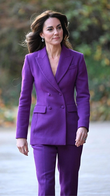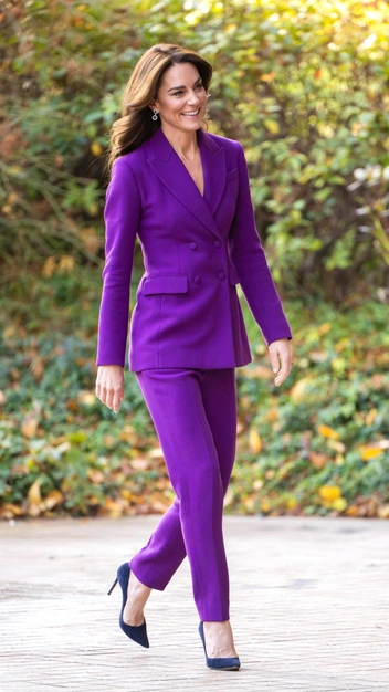 Кейт Миддлтон продолжает пополнять свой гардероб самыми яркими и небанальными костюмами, на которые осмелится далеко не каждая девушка. Например, недавно монаршая особа была замечена в эффектном наряде в фиолетовом оттенке, который стал одним из самых модных в сезоне осень-зима 2023/24. Она примерила приталенный двубортный пиджак и зауженные брюки со стрелками. К луку принцесса Уэльская подобрала синие замшевые лодочки и изящные серьги.