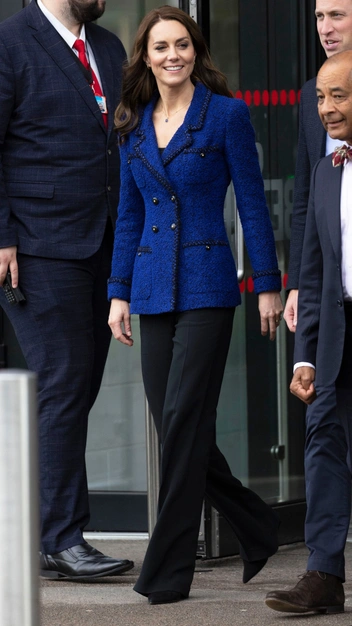 Стиль Кейт Миддлтон всегда продуман до мелочей. Все вещи принцессы Уэльском скроены идеально и подчеркивают достоинства ее фигуры. На этот раз Кэтрин выбрала двубортный жакет приталенного кроя синего цвета, который надела вместе с черными широкими брюками со стрелкой.