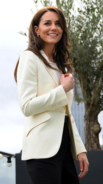 На деловое мероприятие Кейт Миддлтон прибыла в элегантном образе, который за счет цветов и кроя не выглядит строго. Принцесса Уэльская надела белый пуловер, прямые брюки на высокой талии и приталенный жакет в молочном оттенке. Дополнила она выход лаконичными замшевыми лодочками, кожаным ремнем и серьгами-кольцами.