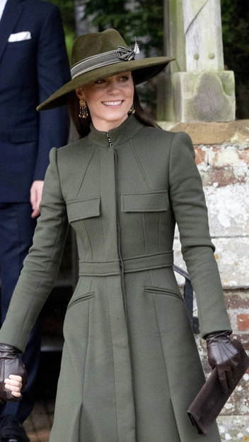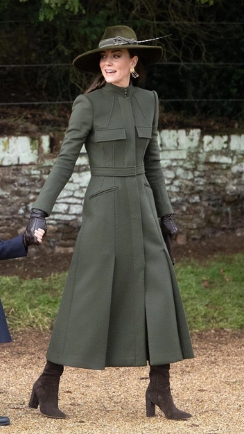 Принцесса Уэльская — образец для подражания. Она всегда выглядит стильно и без изъянов, это подтвердил и ее рождественский выход. Кейт Миддлтон надела пальто-платье со стойким воротом и расклешенной юбкой, к нему подобрала шляпу в цвете хаки. Завершила образ она идеальными аксессуарами: коричневыми замшевыми сапогами, кожаными перчатками и бархатным клатчем. Из украшений принцесса надела висячие серьги французской марки Sezane, выполненные из позолоченной латуни и натуральных камней.