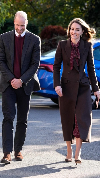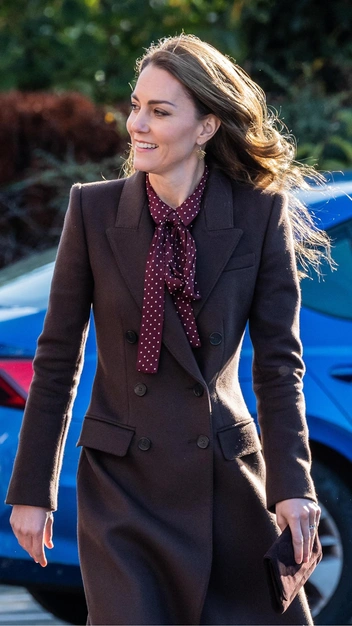 Для своего второго публичного выхода после завершения курса химиотерапии принцесса Уэльская выбрала безупречный наряд в винном оттенке. Она примерила чайное платье с отложным воротником и бантом, усыпанное белым горохом, и подобрала к нему замшевые остроносые лодочки. В качестве верхней одежды Кейт Миддлтон выбрала излюбленное приталенное пальто и завершила женственный образ маленьким клатчем.
