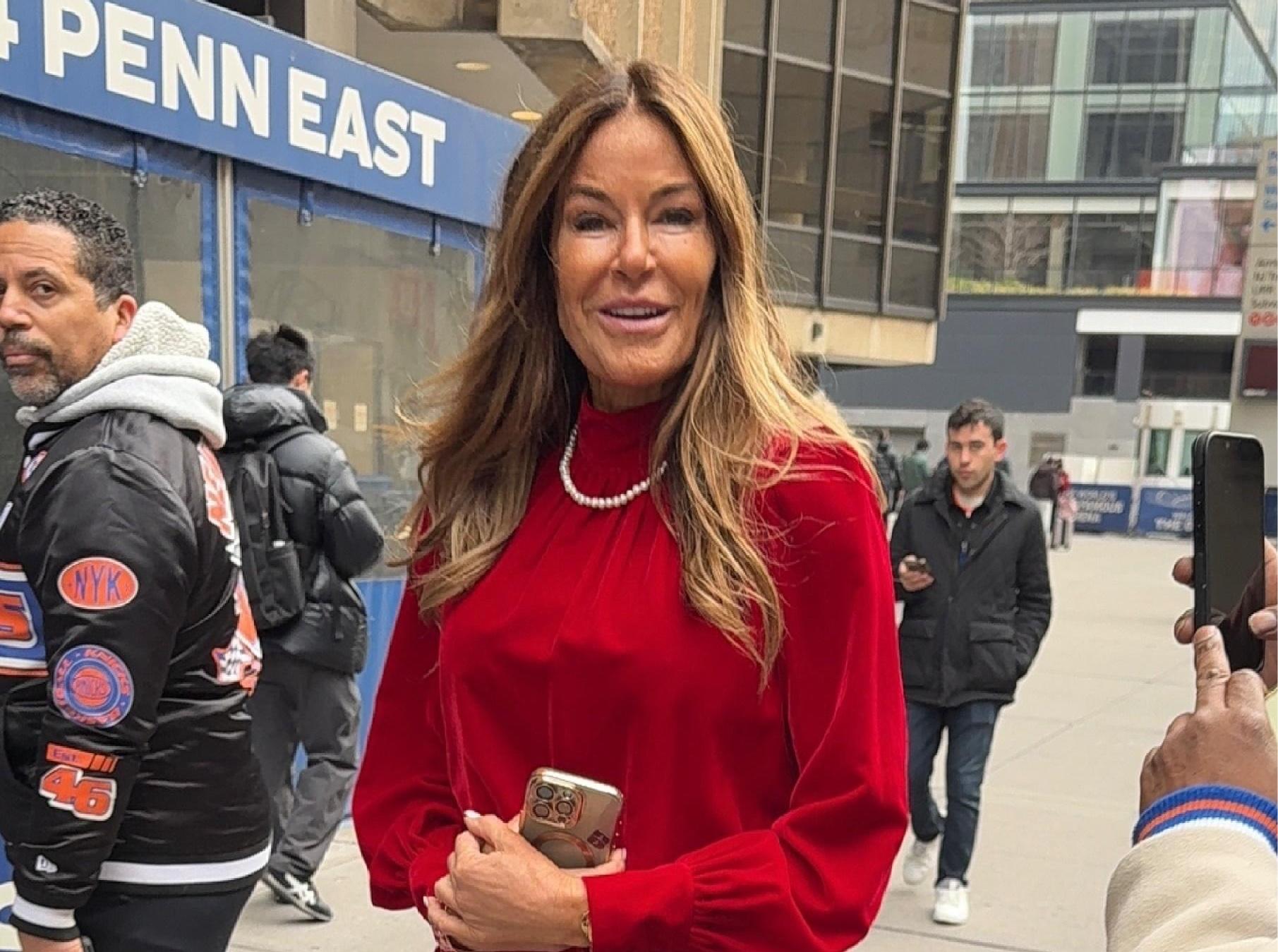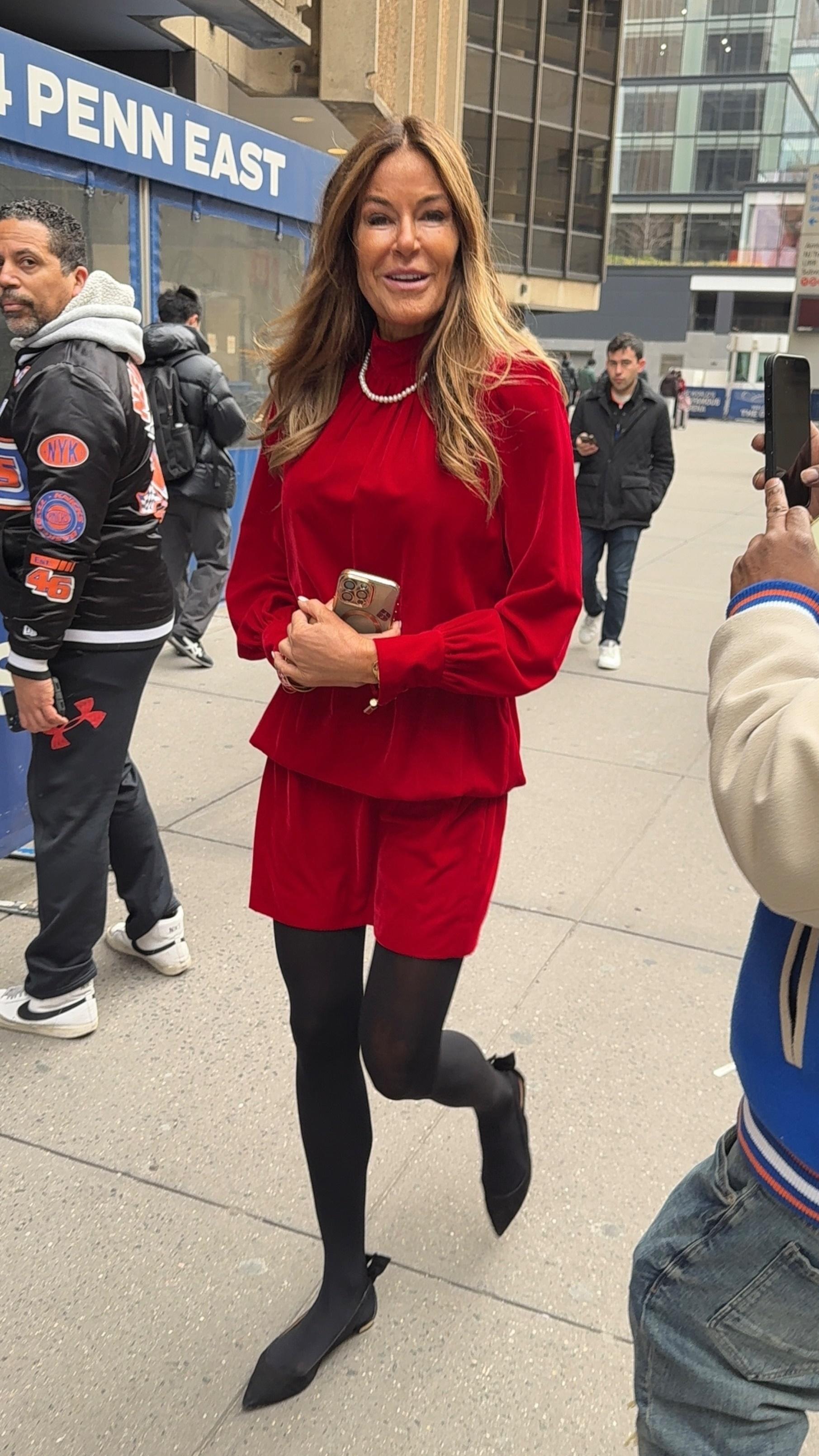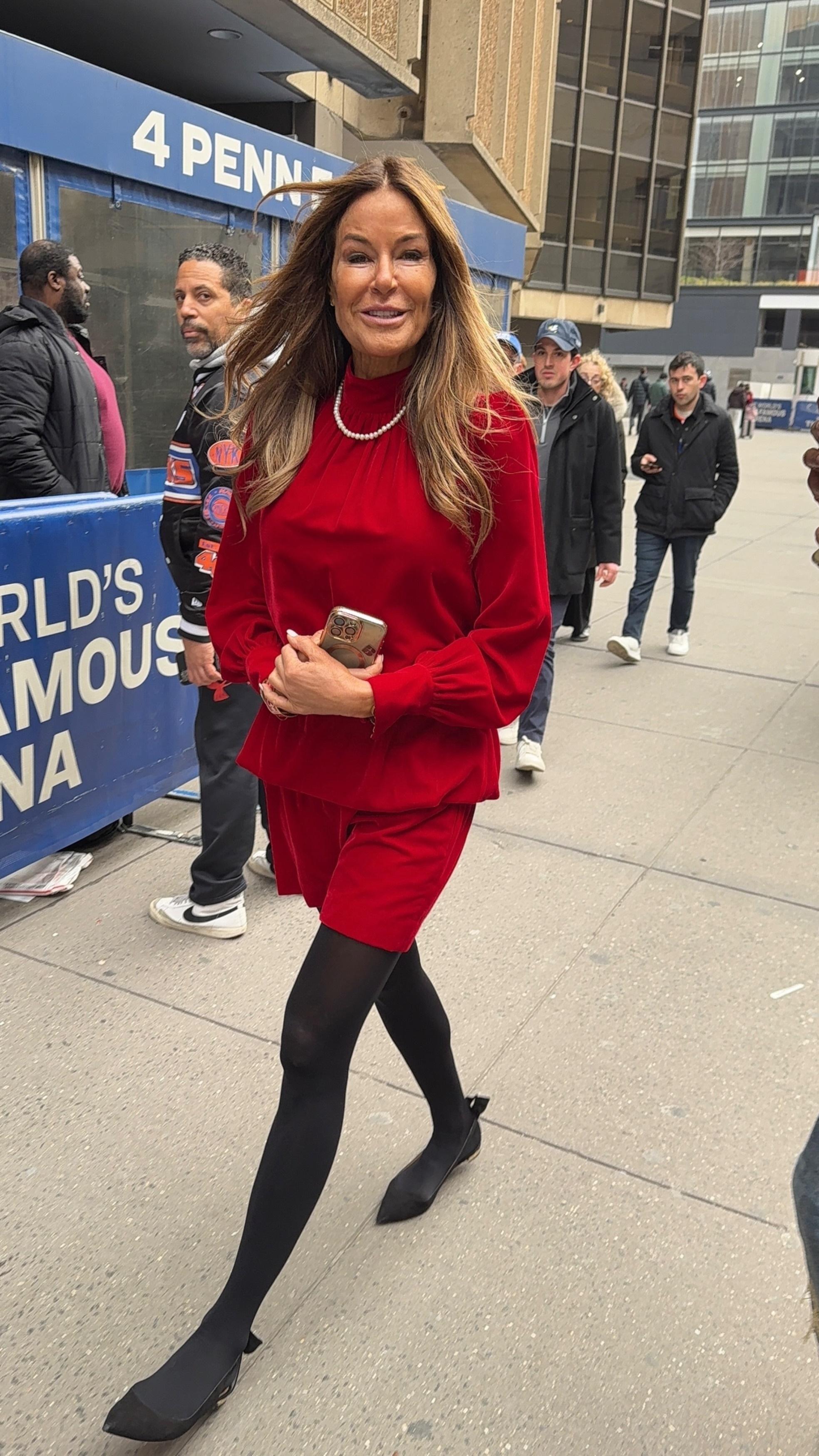 Келли Бенсимон показывает, как носить красный так, чтобы он выглядел и празднично, и по‑деловому. Бархатный тотал‑лук с длинным рукавом и шортами, дополненный черными колготками и остроносыми туфлями, превращает яркий оттенок в универсальный «дневной вечер»: в нем одинаково уместно и на баскетбольном матче, и на светском мероприятии. Жемчужное ожерелье «смягчает» насыщенный цвет и добавляет нотку классического шика.