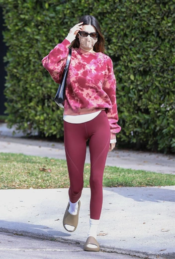 Одна из самых видных модниц Лос-Анджелеса обожает наряжаться и делает это не только во время собора на важные мероприятия или ковровые дорожки, но и каждый день, даже во время будничных тренировок. Накануне Кендалл вновь задала тренд во время привычной поездки в спортзал. Девушка решила примерить красочный свитшот с принтом tie-dye и дополнить его лаконичными лосинами в тон. Завершающими штрихами наряда стали трендовые тапки Yeezy и сумка By Far.