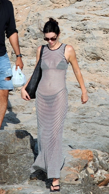 Пока Кендалл Дженнер отдыхает на Ибице с друзьями, мы готовимся к отпуску и рассматриваем все ее пляжные образы. Например, берите на заметку: в этом летнем сезоне в вашем гардеробе обязано появиться «голое» платье. Звезда отдала предпочтение вязаному варианту в полоску и надела под него базовый черный купальник. К модному аутфиту она подобрала вьетнамки, сумку-шопер и очки.