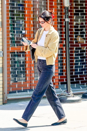 Его модель сочетала с образом в ретро-стиле — впрочем, тут ничего нового, это любимая эстетика Кендалл. Так, Дженнер надела прямые брюки темного оттенка и лаконичные балетки из шелка. Завершение образа — очки в узкой оправе в ретро-стиле и собранная прическа.