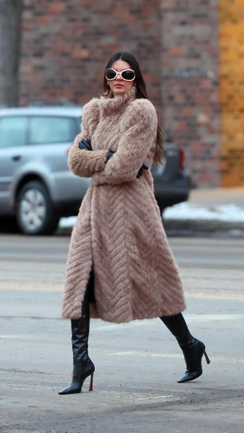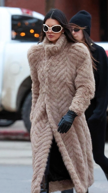 Не знаем, сколько чемоданов Кендалл Дженнер привезла в Аспен, но образов у нее подготовлено много. Еще в одном, от которого девушки будут без ума, главную роль играет шуба длины миди с воротником-стойкой и акцентными плечами. Чтобы аутфит получился футуристичным, селебрити дополнила его очками инопланетянина — именно такие были в тренде несколько лет назад. Завершила модель стильный выход ботфортами на тонком каблуке и кожаными перчатками.