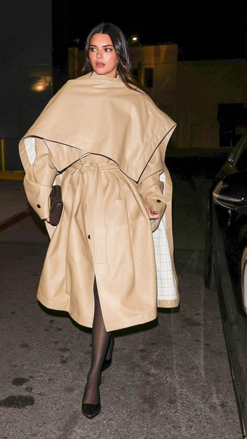 Гардероб топ-модели разделился на две половины: в одной представлены повседневные джинсы, футболки и свитеры, а в другой — безупречные платья, тренчи и юбки в стиле «тихая роскошь». На этот раз знаменитость отдала предпочтение второму варианту и сделала главным героем вечернего образа кожаный бежевый плащ с кейпом. Модный выход Кендалл Дженнер завершила остроносыми туфлями-лодочками и маленькой коричневой сумкой.