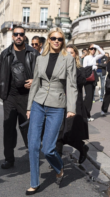 Кендалл Дженнер продолжает выбирать винтажные настроения для своих образов и приковывать к себе взгляды. Так, недавно она была замечена в стильном аутфите, который вы тоже можете повторить. Топ-модель примерила базовый черный лонгслив и подобрала к нему приталенный ретро жакет и узкие синие джинсы. Лаконичный образ она завершила остроносыми балетками и узкими солнцезащитными очками.