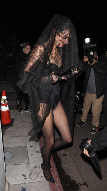 Для вечеринки в честь Дня всех святых Кендалл Дженнер облачилась в образ темной невесты. Звезда примерила черное боди и ажурную фату. Аутфит дополнили полупрозрачные колготки и туфли с острым мысом.