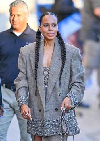 Актриса Керри Вашингтон отправилась на шоу Джимми Киммела в смелом образе. Оверсайз-пиджак дополнила юбка-карандаш с высоким вырезом, который подчеркнул фигуру актрисы. Обратим внимание на детали — серый лаконичный цвет разбавил рисунок из серебряных страз, который можно заметить и на сумке актрисы. В качестве прически Керри решила убрать волосы с помощью лака и геля для укладки и сделать две низкие косы.